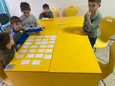 Надовезали смо се на прву активност и започели упознавање са словима и гласовима. Кроз игру меморије деца су тражила парове истих слова – велико и мало, уз коришћење Монтесори материјала. Они који нису знали правила игре брзо су их научили, а на крају смо прогласили места. Разговарали смо о томе да није важно ко је победио, већ да је најбитније дати све од себе и уживати у игри.